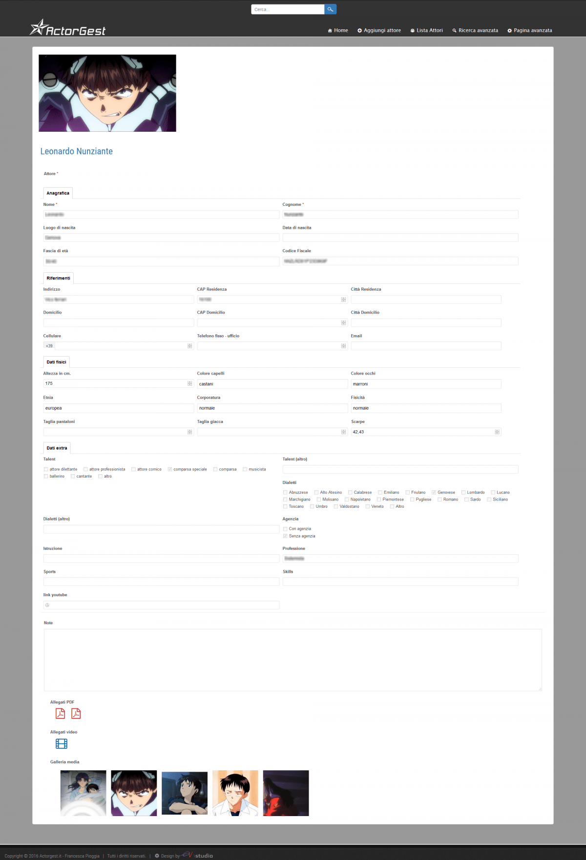 Actorgest è un semplice gestionale Web per l’ archiviazione e la ricerca a campi incrociati di schede anagrafiche per un agenzia di recruiting di attori e comparse per film e spot pubblicitari.